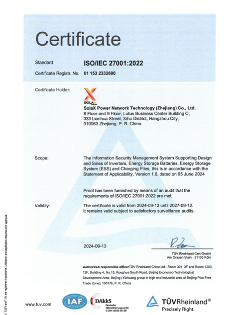 A SolaX a legmagasabb minőségi, biztonsági és megbízhatósági szabványokat tartja fenn nemzetközileg elismert tanúsítványokkal. Szigorú minőség-ellenőrzési rendszereink biztosítják, hogy minden termék megfeleljen az iparági előírásoknak és az ügyfelek elvárásainak. Az kiválóság iránti elkötelezettséggel a SolaX megbízható, nagy teljesítményű napelemes energiarendszereket szállít egy fenntartható jövőért.